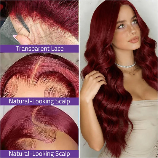 #99J Burgundy Body Wave Lace Wigs 13x6 Transparent Lace Front Human Hair Wigs 40 Inch 13x4 HD Lace Frontal Red Wine Colored Wigs