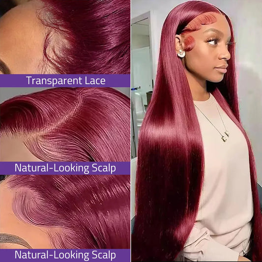 36 Inch Burgundy Wig 13x6 Hd Lace Frontal Human Hair Wig Straight Hair Lace 99J Colored Human Hair Transparent Lace Wig On Sale.