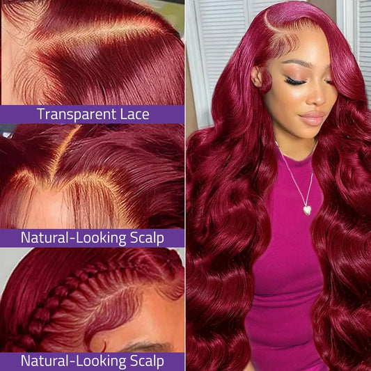 36 Inch Human Hair 13x6 Transparent Lace Wig Body Wave 99J Burgundy Lace Front Wig 13x4 Swiss HD Lace Red Colored Wig For Women.