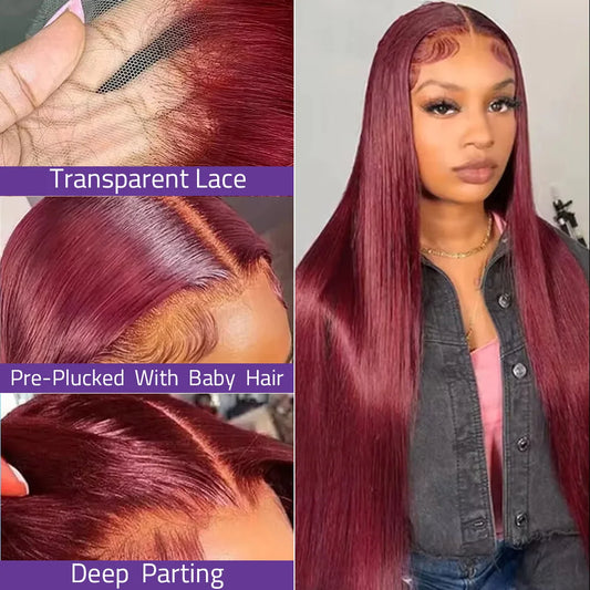 Bone Straight 99j Burgundy 13x6 HD Lace Front 100% Human Hair Wig Pre Plucked Lace Colored 13x4 Hd Lace Frontal Wigs for Women