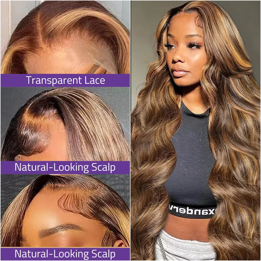 4/27 Highlight Ombre Wig Human Hair Body Wave 13x6 Lace Front Wig Pre Plucked Transparent Lace Frontal Wigs 200% Density 30 Inch