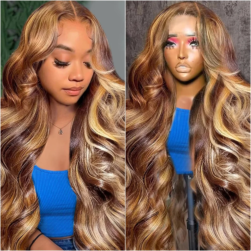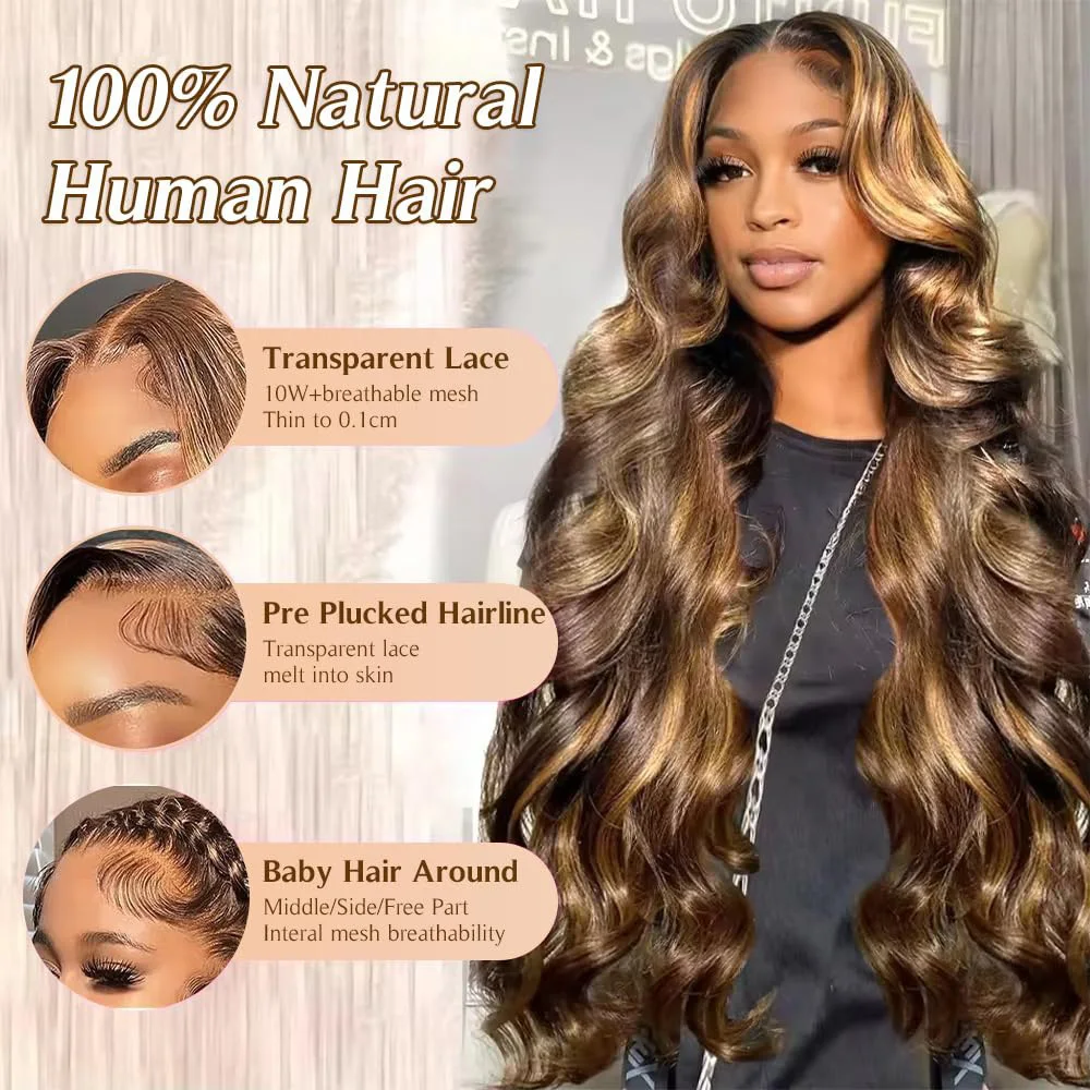 Blonde Highlight Body Wave Lace Wig 13X4 13x6 HD Transparent Lace Frontal 100% Human Hair Wig For Women Hightlight P4/27 Wig .