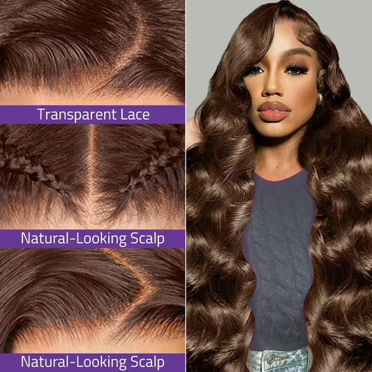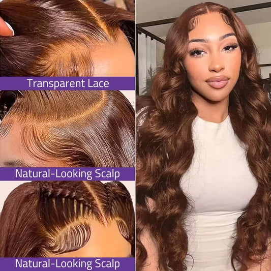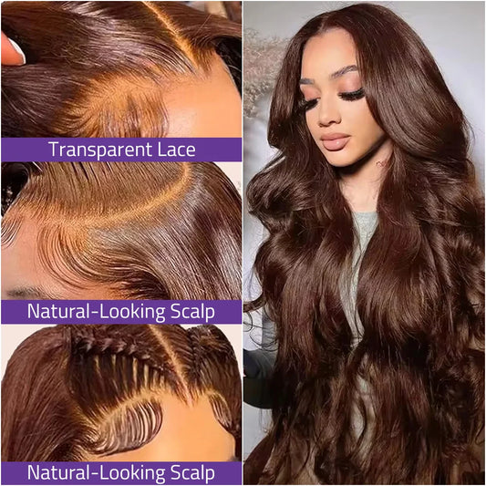 Chocolate Brown Body Wave Lace Wigs 13x6 HD Transparent Lace Front Wigs 100% Brazilian Human Hair Wigs 200 Density For Women.