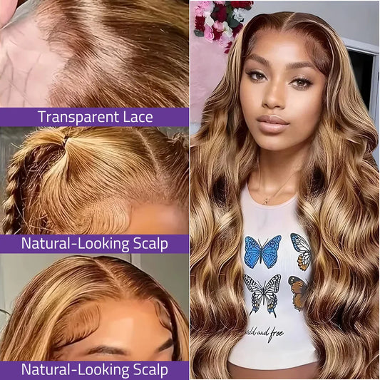 P/427 Highlight Body Wave 13x6 HD Lace Front Human Hair Wigs, 13x4 Lace Frontal Wigs for Women, Water Wave 36-Inch Colored Wigs.