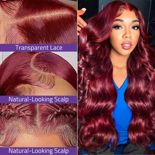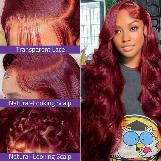 Body Wave Brazilian Human Hair Wig 13x4 13x6 HD Transparent Lace Frontal Wig 99j Burgundy Red Colored Wig 18-36 Inch On Sale.