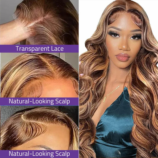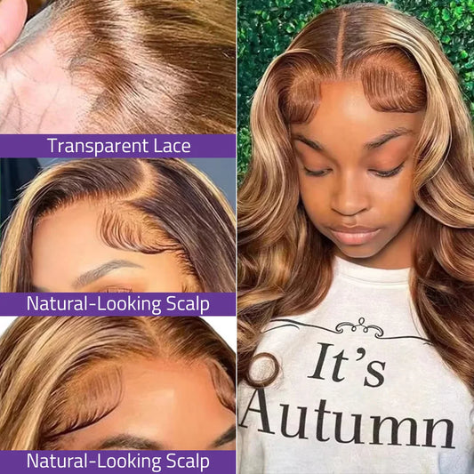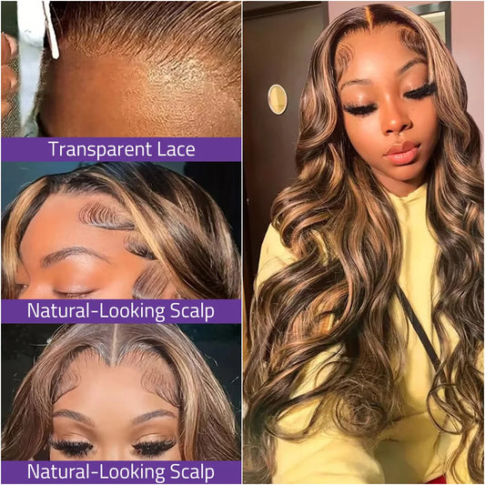 36 Inch Highlight Body Wave Human Hair Wig P4/27 Honey Blonde 13x6 HD Lace Frontal Wig 13x4 Lace Front Wig Curly Wig 200 Density