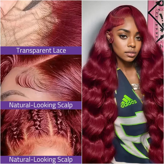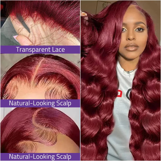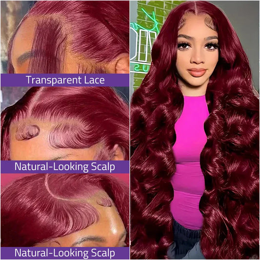 #99J Burgundy Body Wave Lace Wigs 13x6 Transparent Lace Front Human Hair Wigs 40 Inch 13x4 HD Lace Frontal Red Wine Colored Wigs