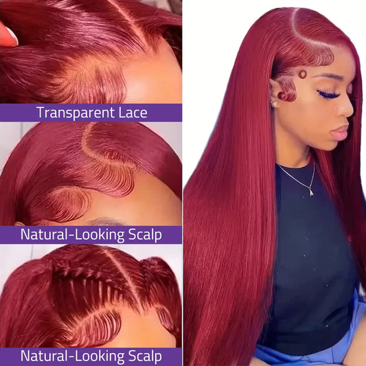 99J Burgundy Bone Straight Transparent Lace Wig 13x4 13x6 HD Lace Front Human Hair Wig Pre-Plucked 18-40 Inch Brazilian Hair Wig